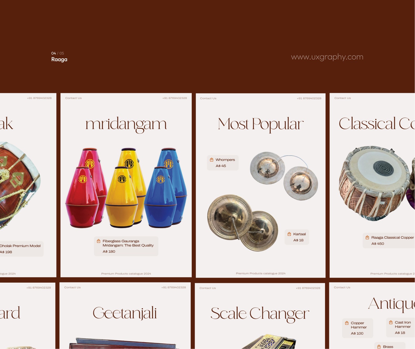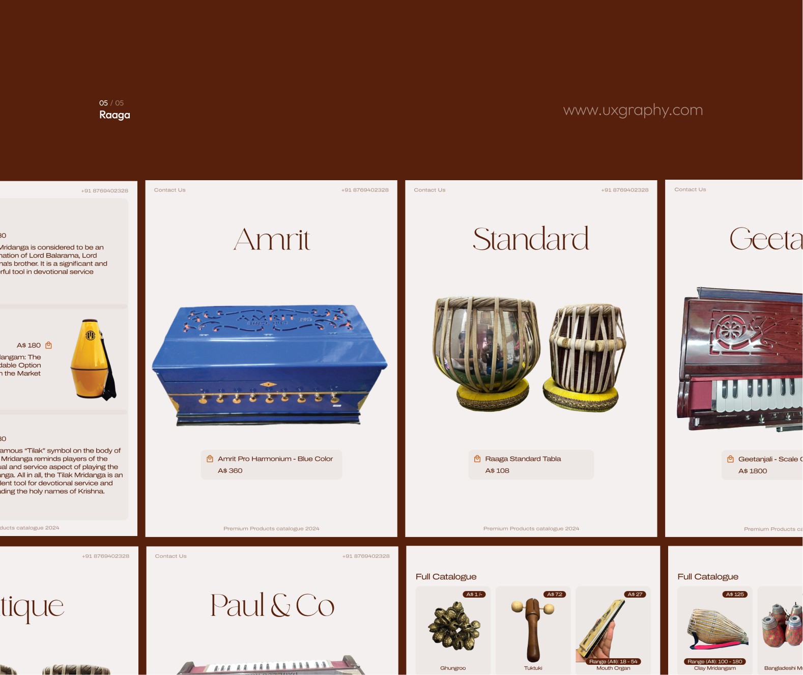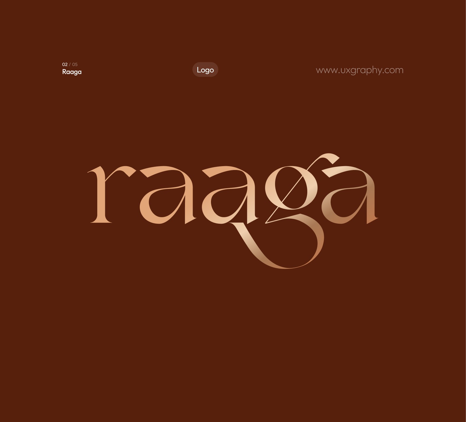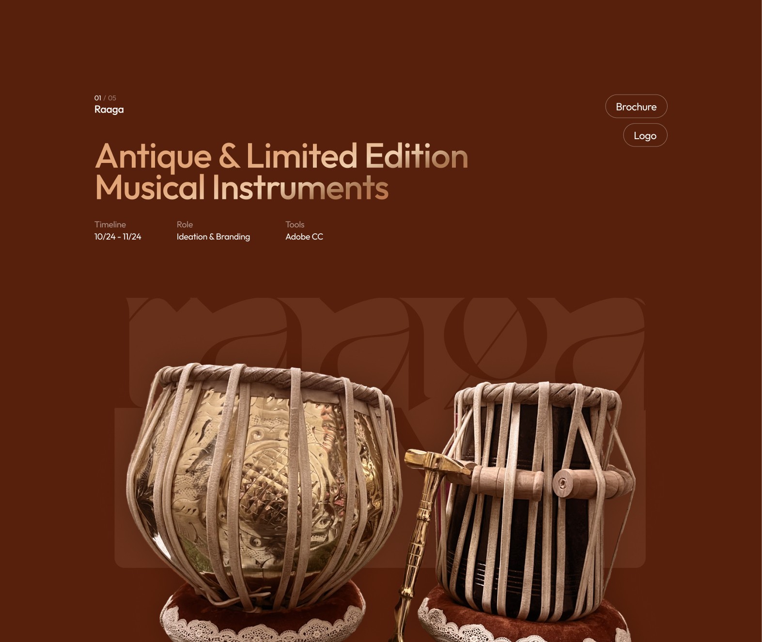 An identity system created for Raaga, a brand curating antique and limited-edition musical instruments. The design reflects the richness of sound and tradition through crafted forms, timeless typography, and warm metallic tones.